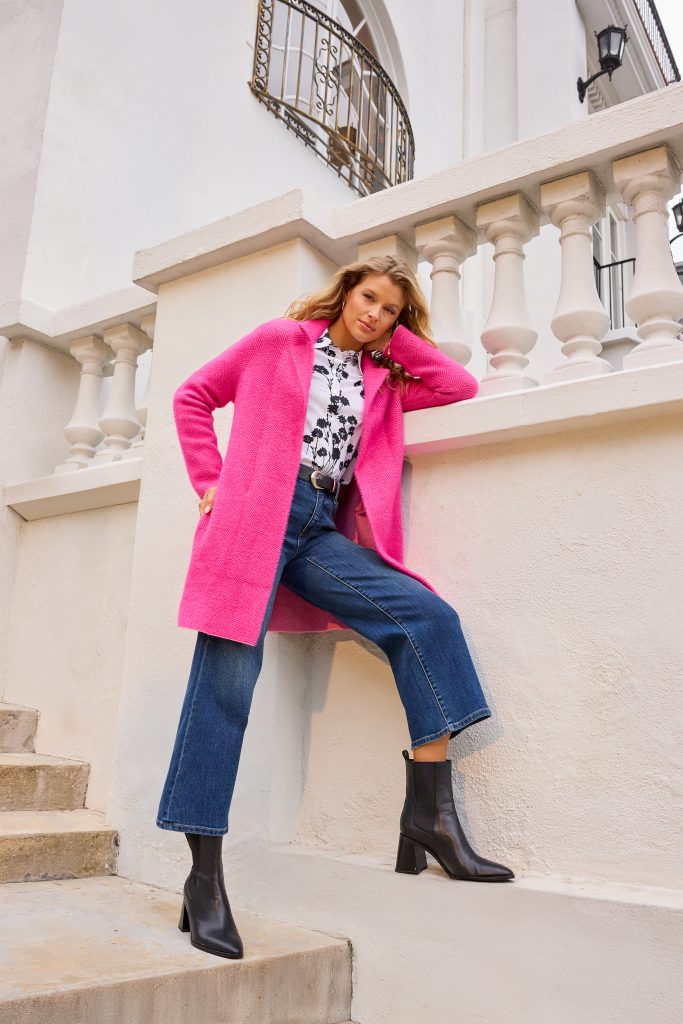 This long sleeve open front sweater coat blends the warmth of a knit with the polish of outerwear. Designed with a clean, draped silhouette and soft structure, it layers beautifully over everything from denim to dresses. Cozy yet elevated — it’s the perfect finishing piece for transitional days and chilly evenings. Feathery yarns knit in a herringbone pattern dial up the irresistible softness of this long cardigan that makes layering between seasons an easy choice.