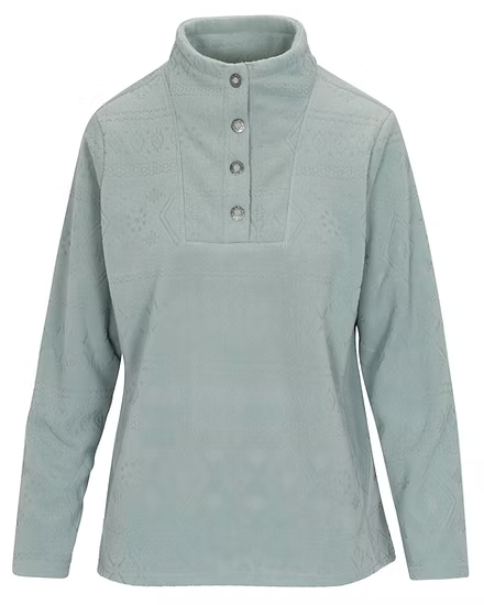 This cozy fleece mock neck is the perfect year round layering piece! In a gorgeous pale blue "Abyss" color with a simple yet eye catching textured pattern, this ultra soft fleece features a button up quarter neckline and pockets.